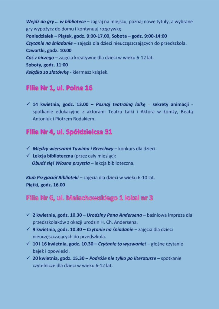 Już niedługo w Filii nr 1 (ul. Polna 16) uczniowie ze Szkoły Podstawowej nr 5 im. Stanisława Staszica w Łomży będą mieli możliwość wziąć udział w niezwykłym spotkaniu z aktorami Teatru Lalki i Aktora w ŁomżyBeatą Antoniuk i Piotrem Rodakiem!